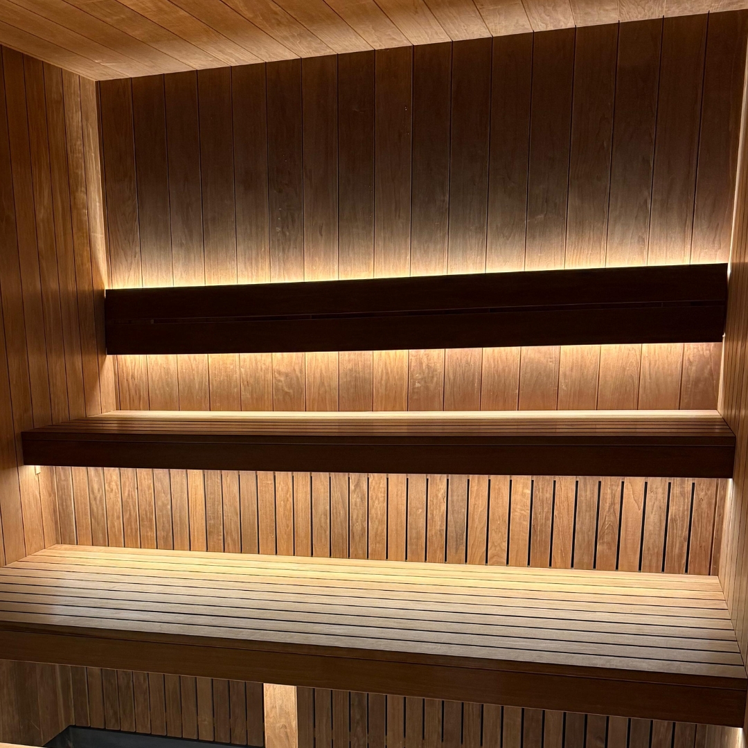 LED lighting in the back supports and the exterior of the sauna